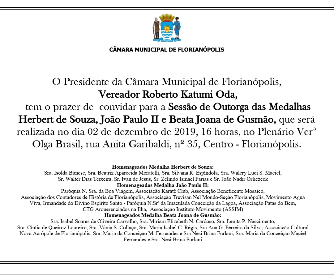 Juntamente com a ASSIM SC, receberam a Medalha João Paulo II a Paróquia Nossa Senhora da Boa Viagem, Associação Karatê Clube, Associação Beneficente Mosaico, Associação de Contadores de Histórias de Florianópolis, Associação Trevisan Nel Mondo – Sessão Florianópolis, Movimento Água Viva, Irmandade do Divino Espírito Santo – Paróquia Nossa Senhora da Imaculada Conceição da Lagoa, Associação Patas do Bem e CTH Aquerenciados na Ilha.